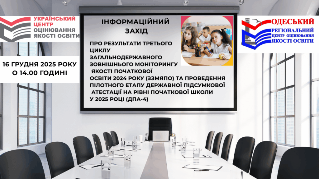 16 грудня 2025 року о 14.00 годині Українським центром оцінювання якості освіти та Одеським регіональним центром оцінювання якості освіти буде проведено інформаційний захід про результати третього циклу загальнодержавного зовнішнього моніторингу якості початкової освіти 2024 року (ЗЗМЯПО) та проведення пілотного етапу Читати далі …