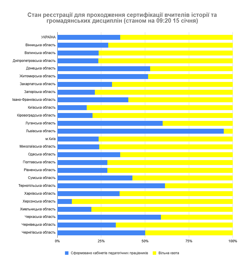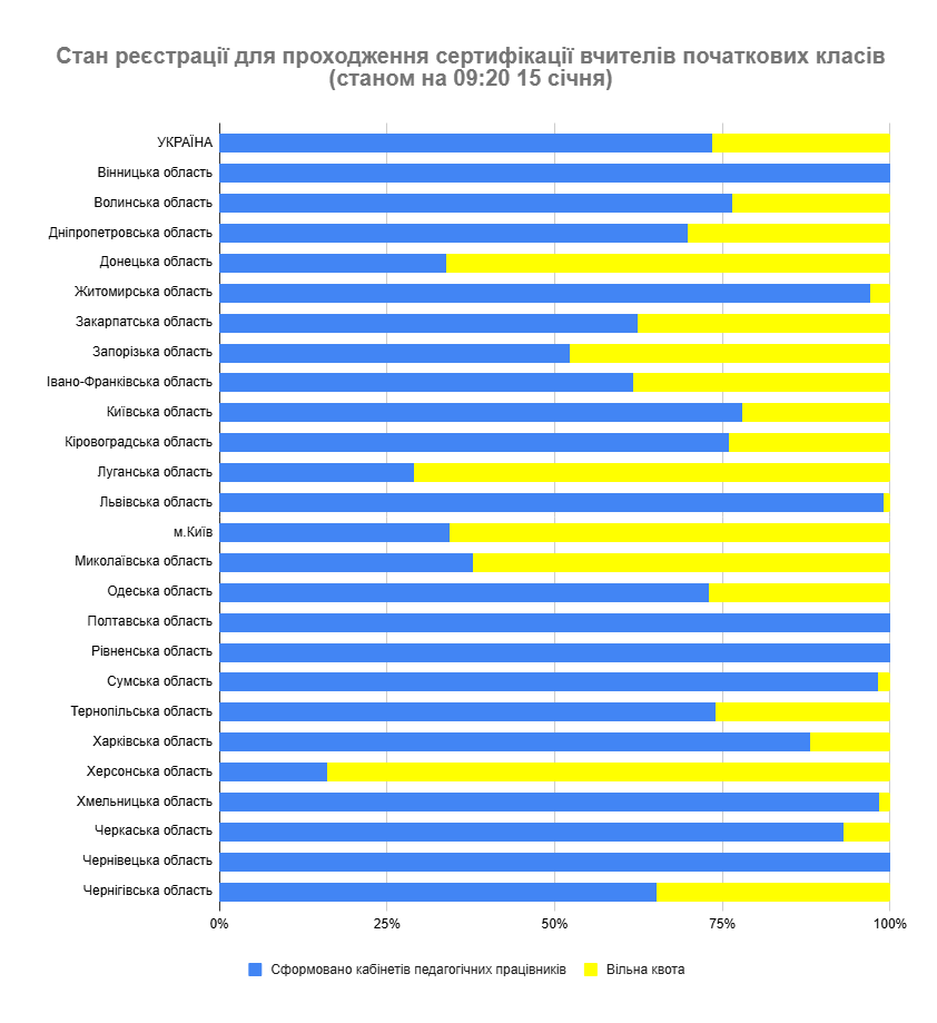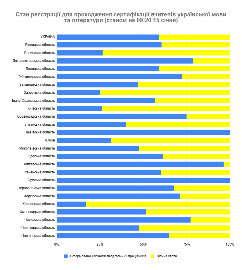 Станом на 9:20 15 січня 2026 року вже надіслали до регіональних центрів оцінювання якості освіти (РЦОЯО) документи на оброблення 1287 учителів початкових класів, 442 учителі української мови та літератури, 425 учителів математики, 269 учителів історії та громадянських дисциплін, а також 523 учителі іноземної мови (англійської).