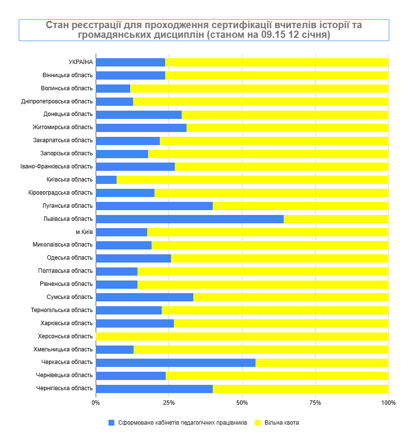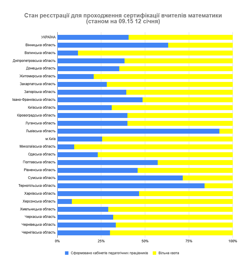 Станом на 9:15 12 січня 2026 року вже надіслали до регіональних центрів оцінювання якості освіти (РЦОЯО) документи на оброблення 1066 учителів початкових класів, 346 учителів української мови та літератури, 305 учителів математики, 178 учителів історії та громадянських дисциплін, а також 323 учителя іноземної мови (англійської).