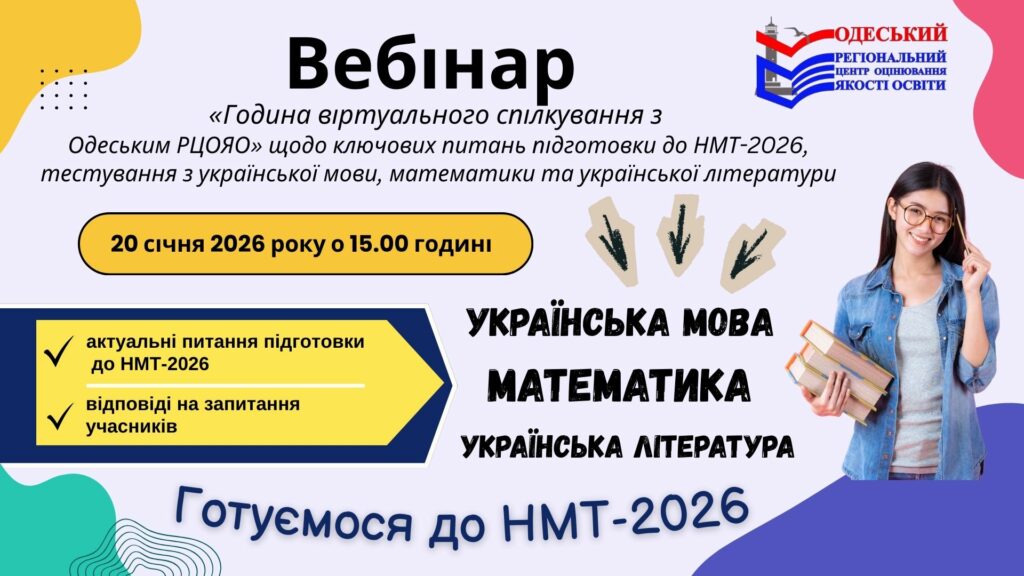 Під час вебінару працівниками ОРЦОЯО будуть висвітлені ключові питання підготовки до проведення національного мультипредметного тесту 2026 року, підготовки до складання української мови і математики як обов’язкових предметів НМТ, української літератури як предмета НМТ на вибір, та надані відповіді на запитання учасників вебінару. Підключення учасників вебінару відбуватиметься 20 січня 2026 року з 14.00 до 15.00 години на головній сторінці сайту Одеського РЦОЯО http://www.test-center.od.ua/ за посиланням, яке буде розміщено в день проведення вебінару.